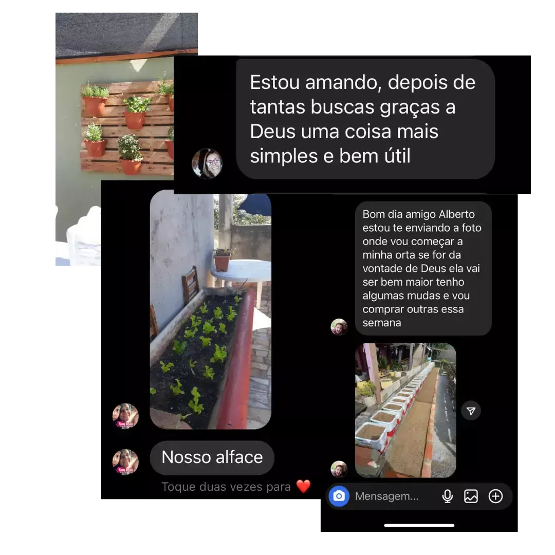Este método por ser mais rápido e limpo se tornou um sucesso em vasos e jardineiras. Foi aí que pedi ao meu filho se ele não nos ajudaria a gravar um curso completo sobre tudo que sabemos de horta para que as pessoas pudessem plantas em suas casas, mas não só plantar, mas que as verduras ficassem bonitas e elas felizes por terem conseguido, e depois de um ano inteiro gravando, está aqui, muitos alunos com suas hortas e nós muito felizes por ter realizado este sonho!